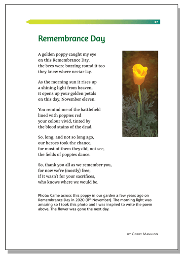 So many of Gerry's poems strike a chord of resonance in the reader ... Neighbours, Father's Day, Remembrance Day and The Road to Loughrea Lake to name just a few.