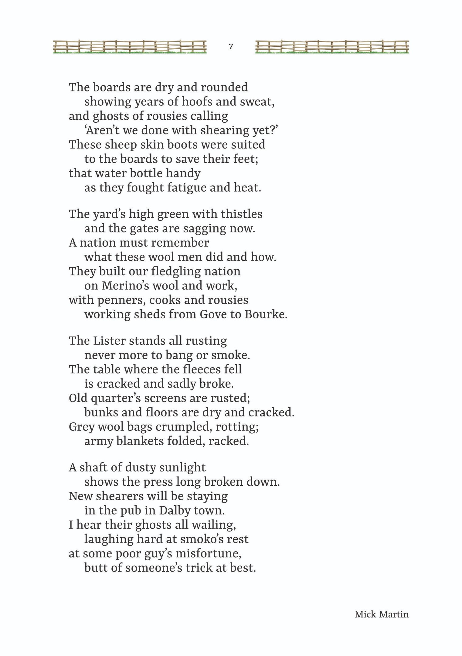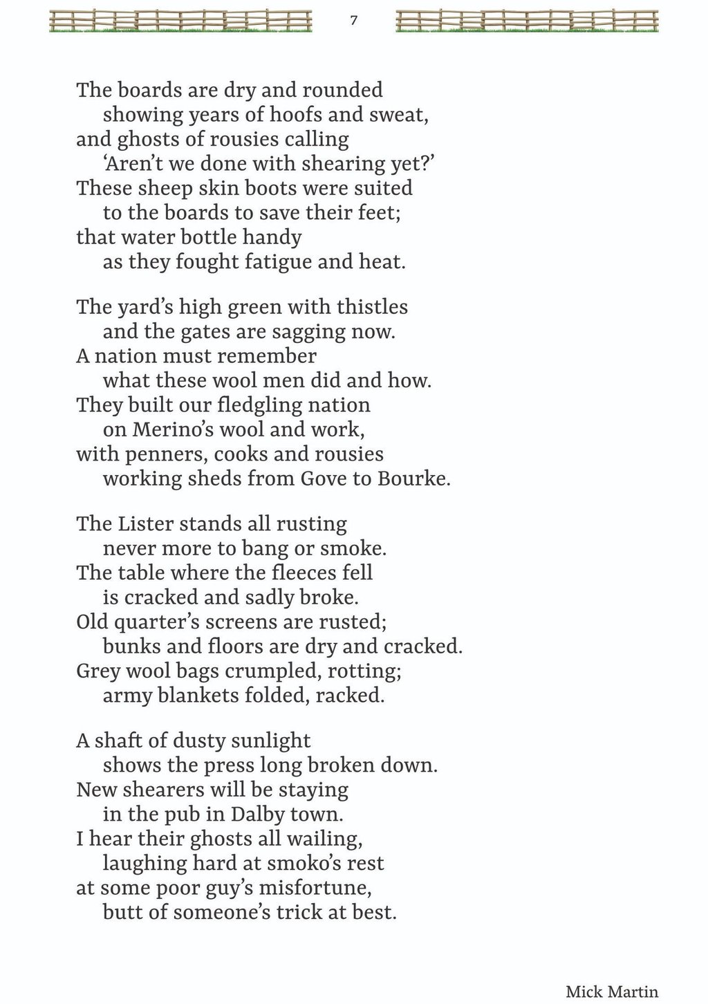 Mick Martin has performed at diverse events across Queensland. His poetry has been published many times in national magazines including R.M. Williams Outback magazine and he has been a frequent guest on ABC radio to recite his poetry.