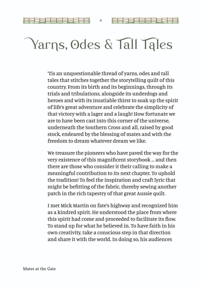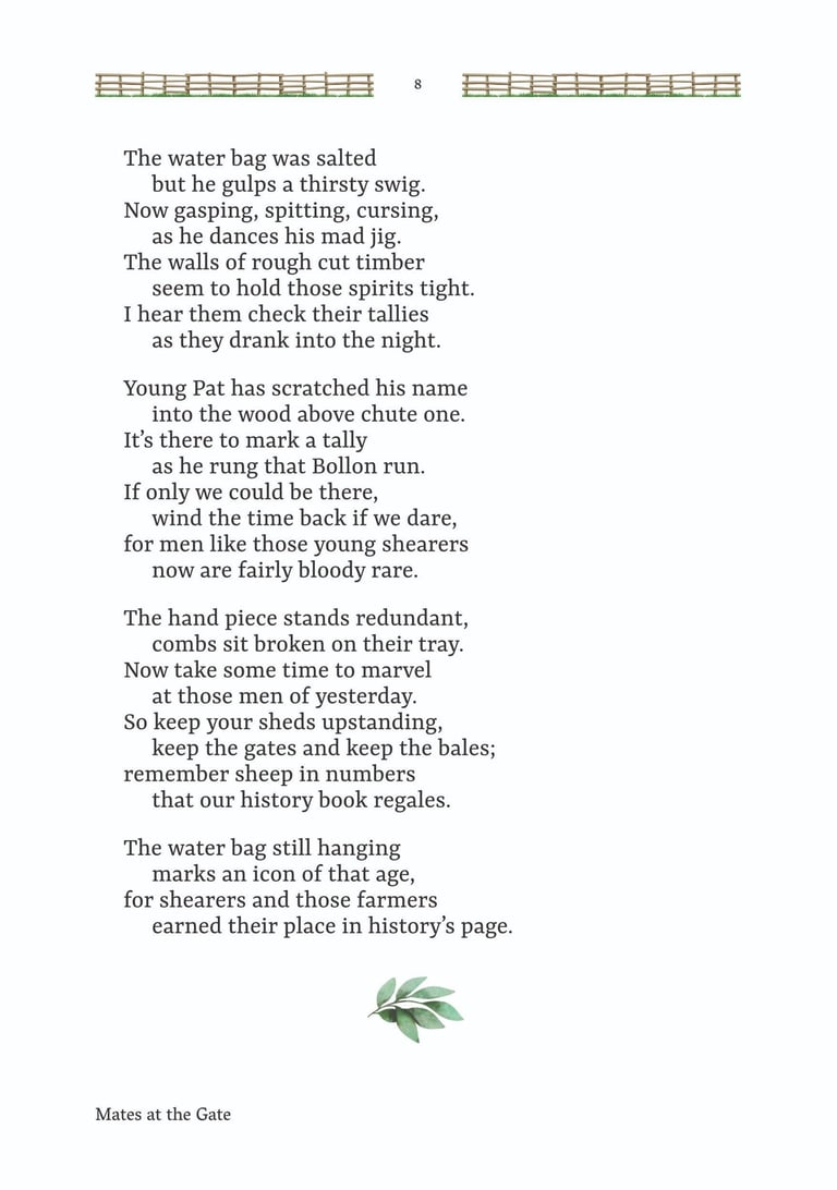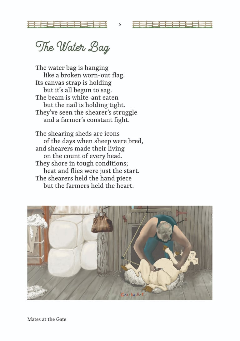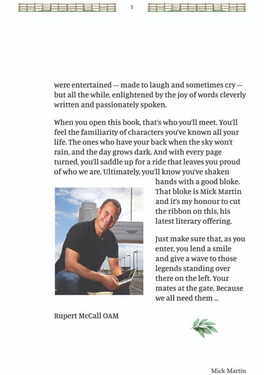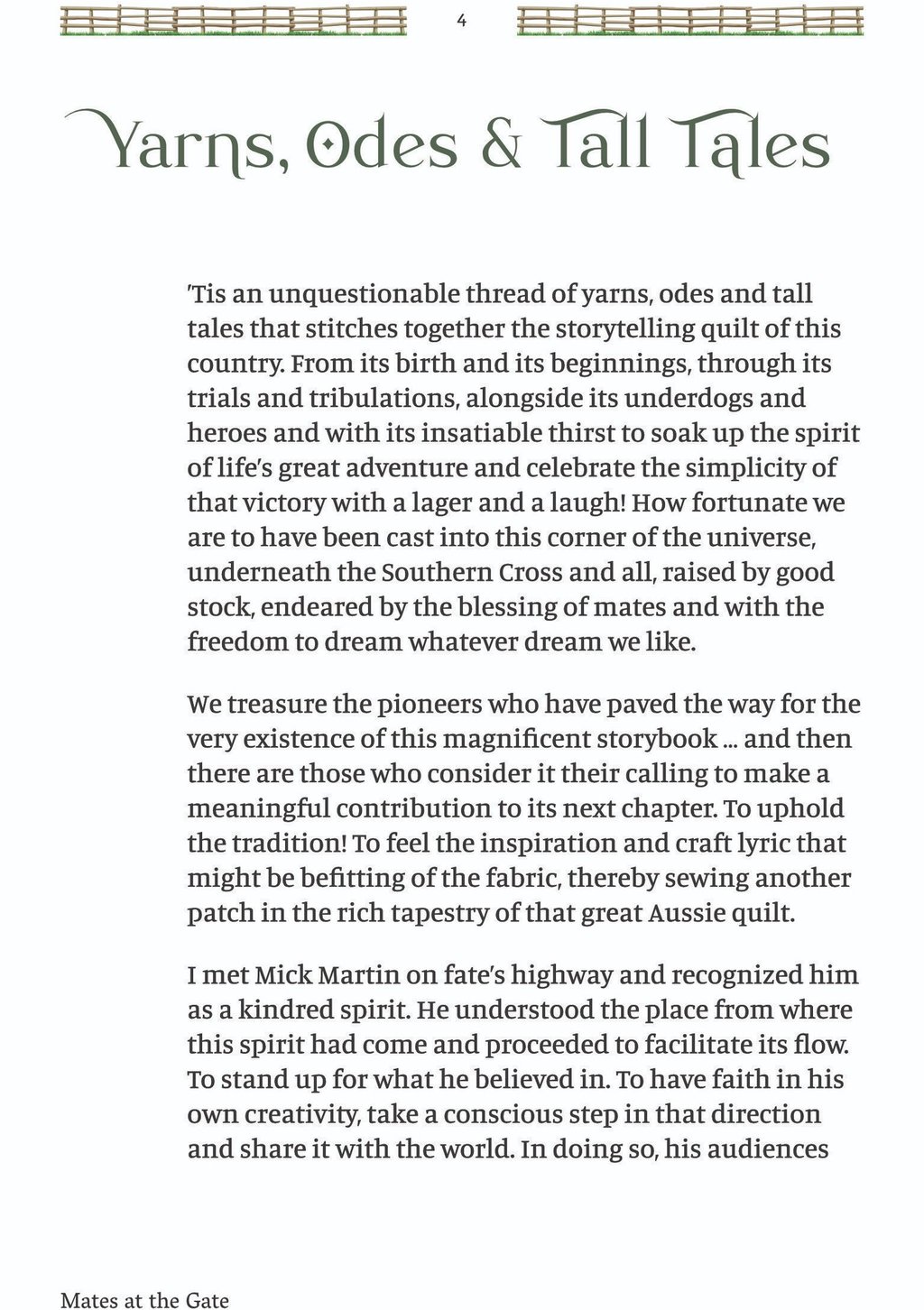 'Mates at the Gate' is a collection of Australian bush poetry and stories. Three stories and 25 poems were written by Mick Martin, with five poems written by Glenny Palmer, Jan Facey, Mal Beveridge, Henry Lawson and PJ Hartigan (John O’Brien). The introduction, 'Yarns, Odes & Tall Tales', was written by Rupert McCall.
