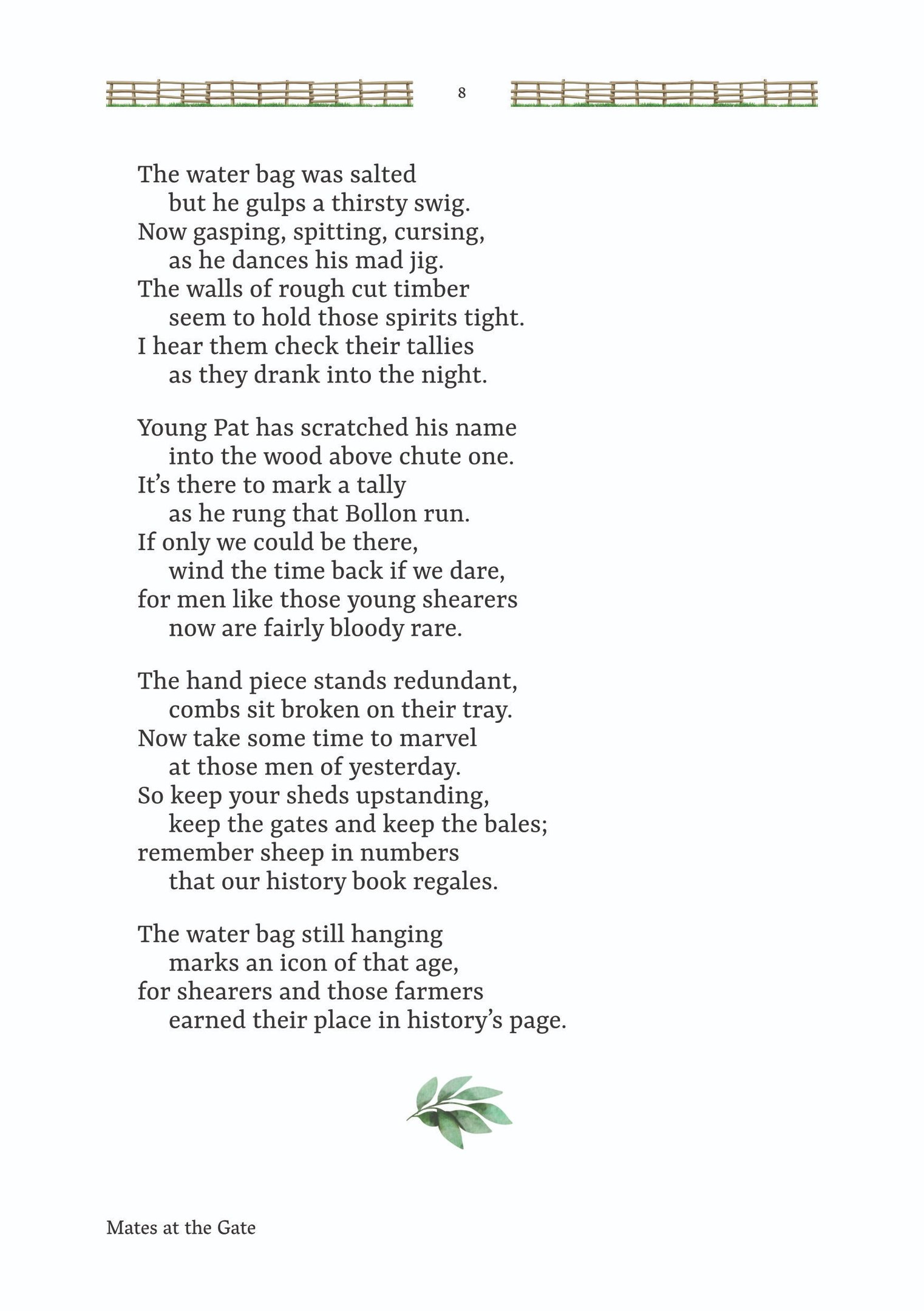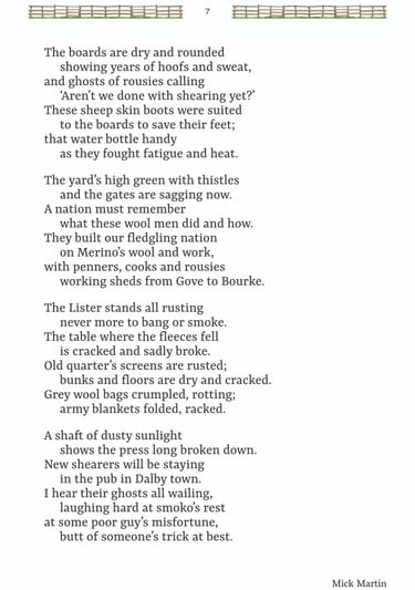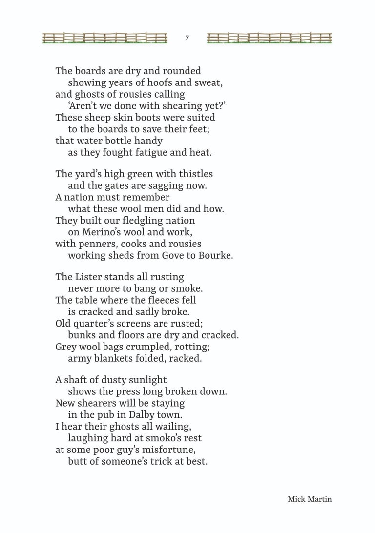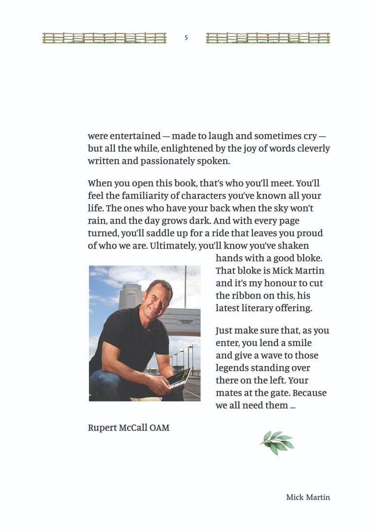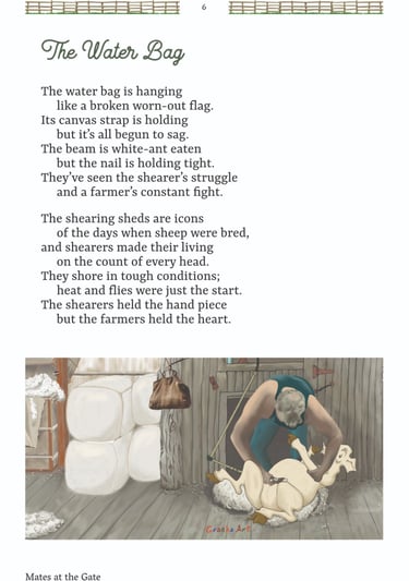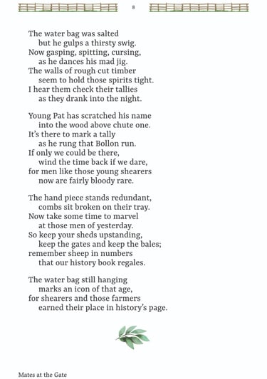 'Mates at the Gate' is a collection of Australian bush poetry and stories. Three stories and 25 poems were written by Mick Martin, with five poems written by Glenny Palmer, Jan Facey, Mal Beveridge, Henry Lawson and PJ Hartigan (John O’Brien). The introduction, 'Yarns, Odes & Tall Tales', was written by Rupert McCall.